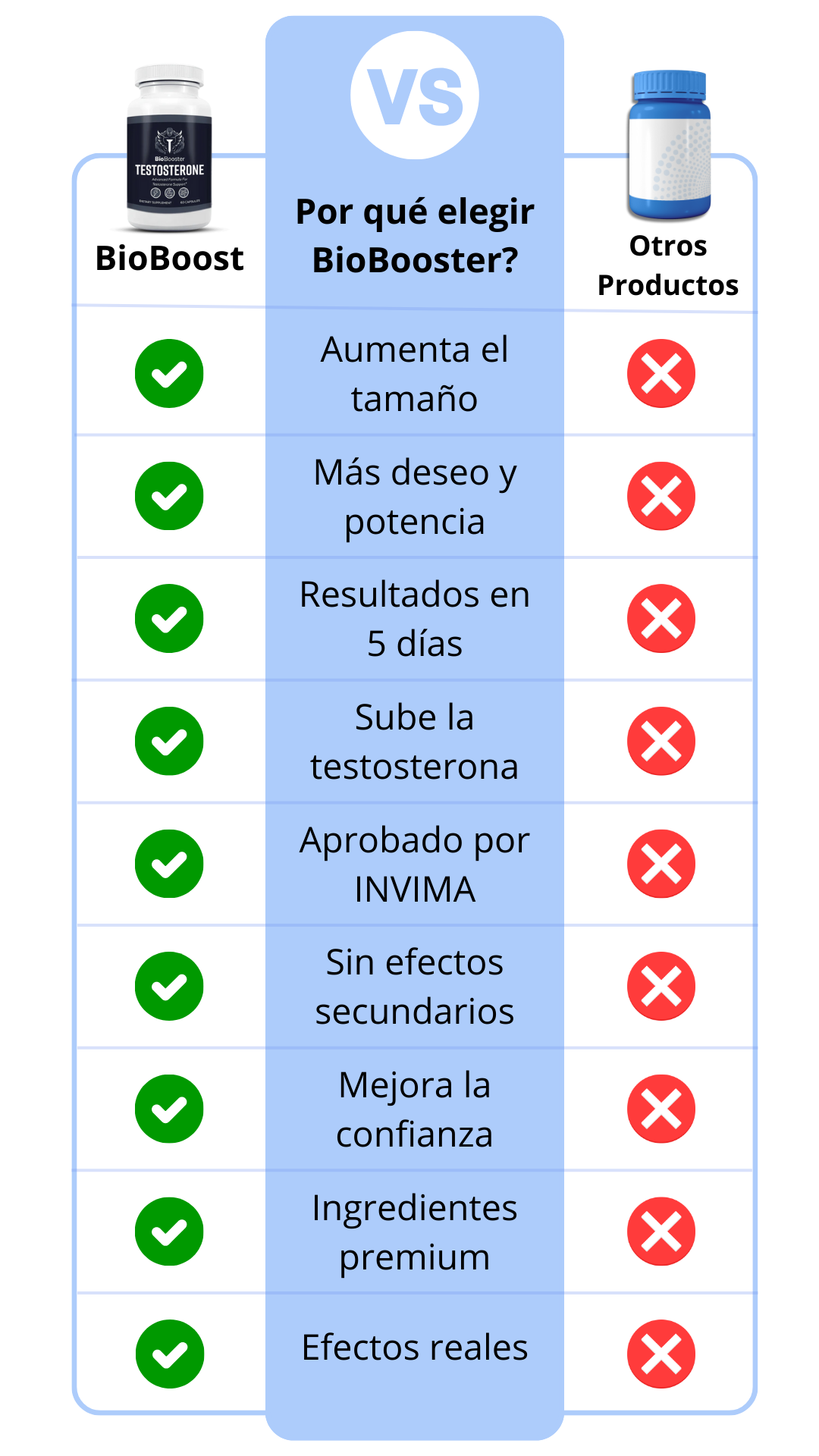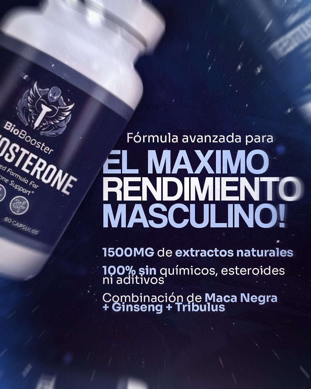 BioBooster estimula de forma natural la producción de testosterona en el cuerpo, gracias a una fórmula avanzada con ingredientes como Maca Peruana, Ginseng Coreano, L-Arginina y Zinc Quelado.